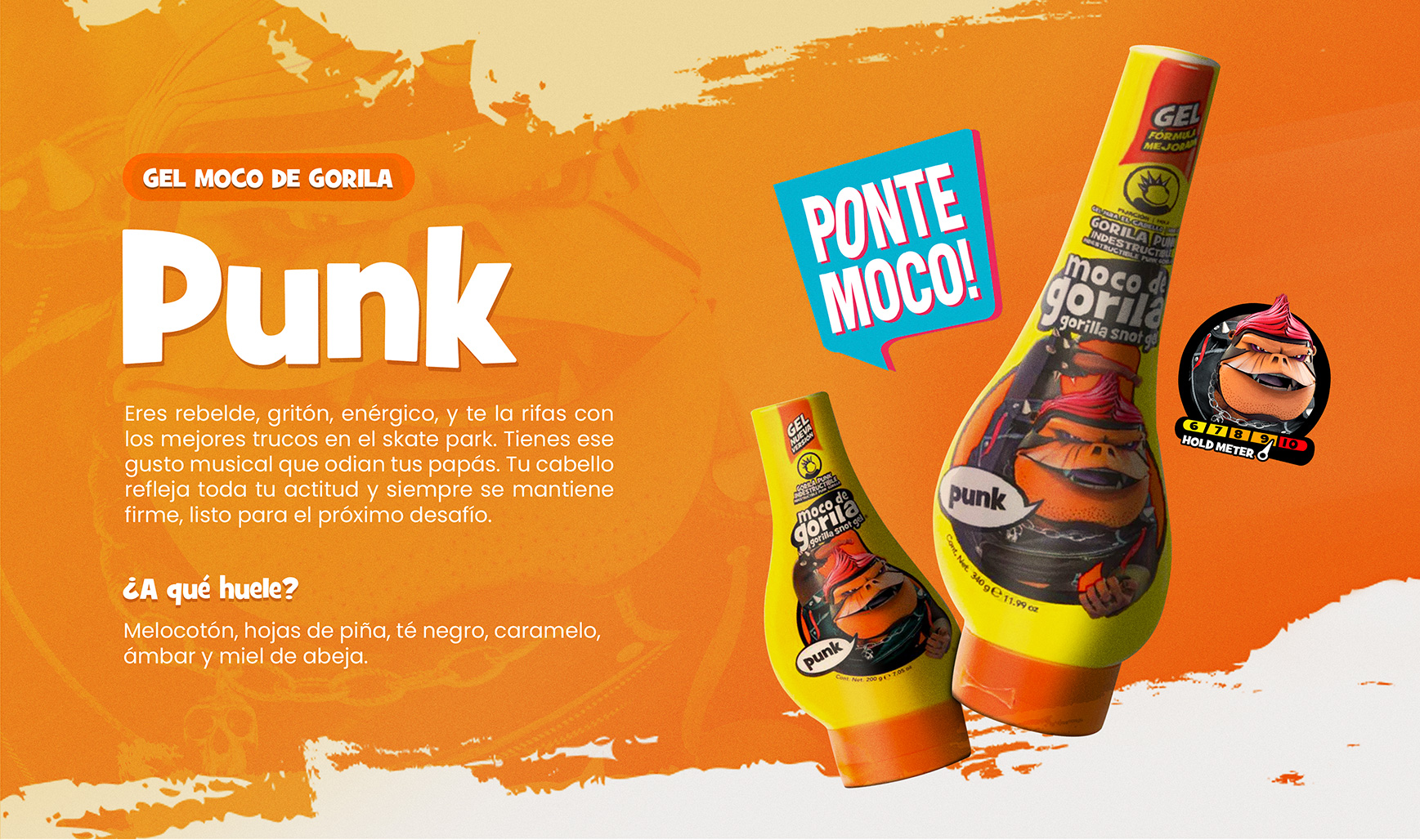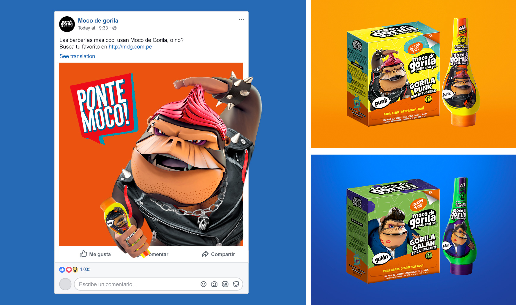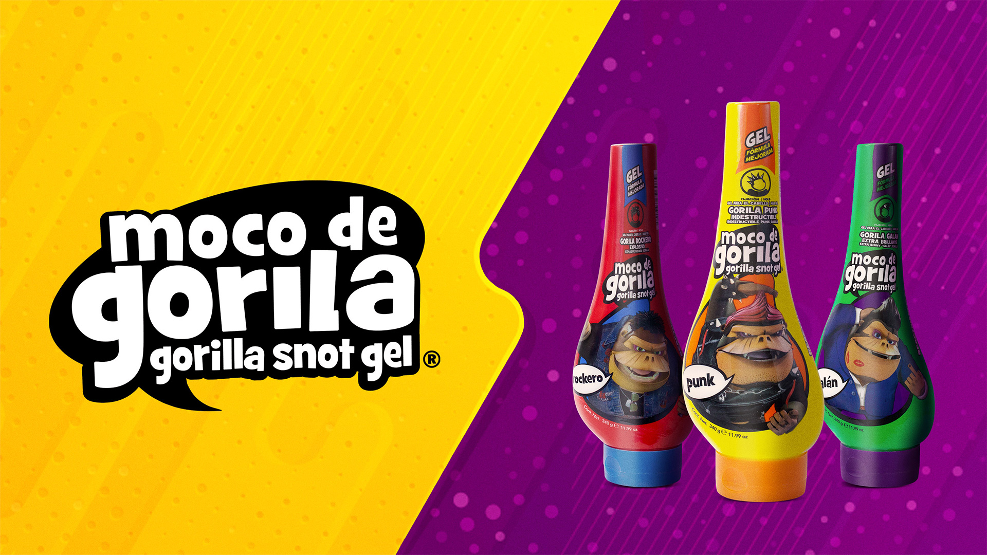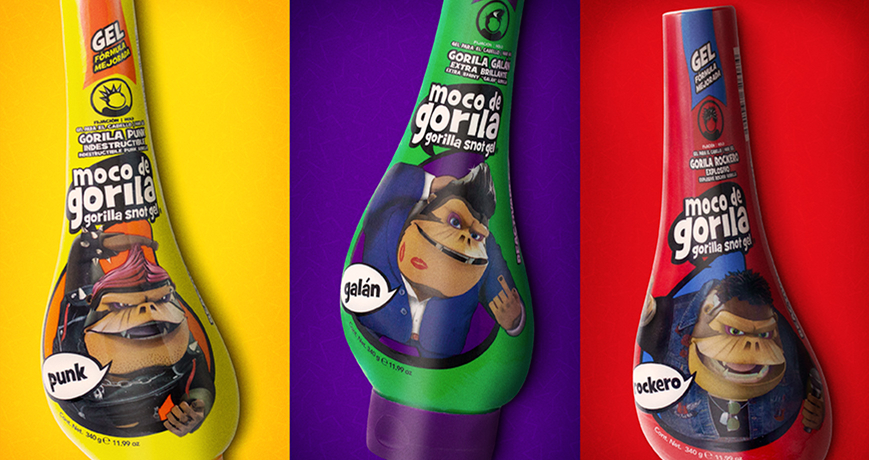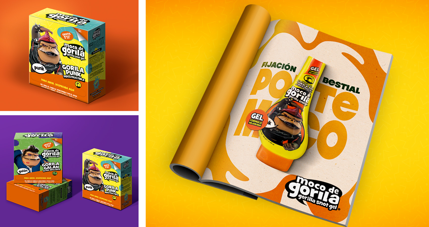 Moco de Gorila es la línea de fijación y estilizado para el cabello mejor posicionada entre el público joven, diseñada especialmente para crear peinados con personalidad. La marca ha decidido seguir fortaleciendo su esencia resaltando los colores juveniles, alegres, deportivos, con un estilo elegante y moderno que los caracteriza, tanto en la presentación de sus empaques como en sus redes sociales, llevándolo a ser más cercano e interactivo con su publico. Asimismo, se sumó artes visuales en diferentes formatos, que comunican la esencia de la presentación escogida.